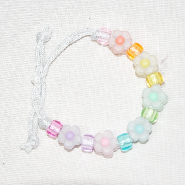 Armband mit weichem weissem leicht schillerndem Textilband und durchsichtigen Schmuckperlen in Farbe und Blumen. Die Blumen sind doppelt aufgezogen, so dass das Armband stabil sitzt. Der Verschluss ist mit einem Schiebemechanismus.