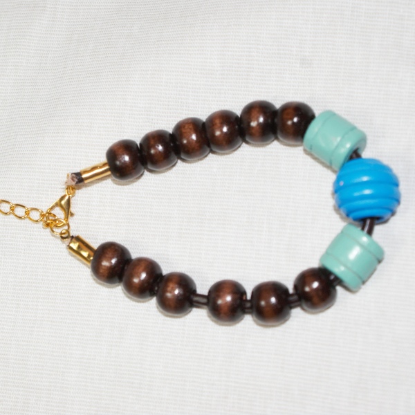Ein dunkles Lederarmband mit dunkelbraunen und in zwei Blautönen gehaltenen Holzperlen verziert.