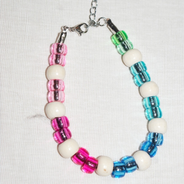 Dunkles Lederarmband mit durchscheinenden Perlen in div. Farben sowie mit weissen Holzperlen verziert. Der in Silber gehaltene Verschluss ist grössenverstellbar.