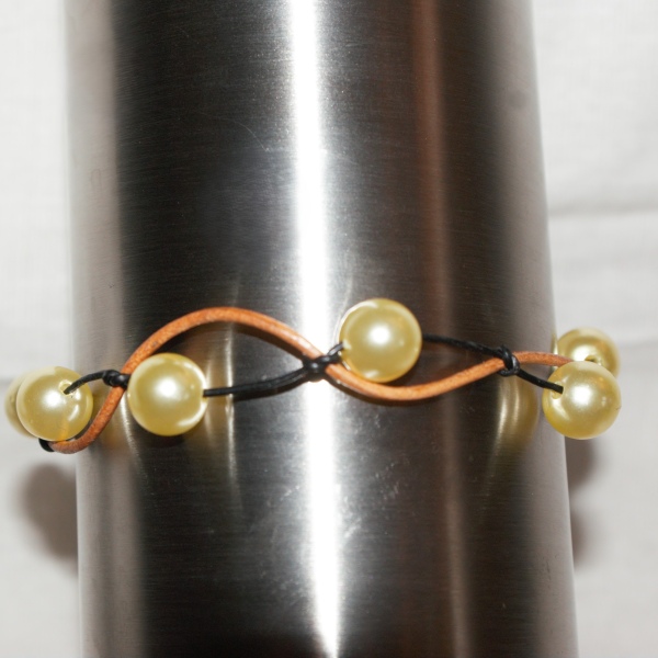 Ein filigran geknüpftes Armband mit zwei Lederbändern in schwarz und hellbraun. Eingeknüpft wurden gelbliche Schmuck-Perlen. Der Verschluss in goldfarben ist grössenverstellbar.